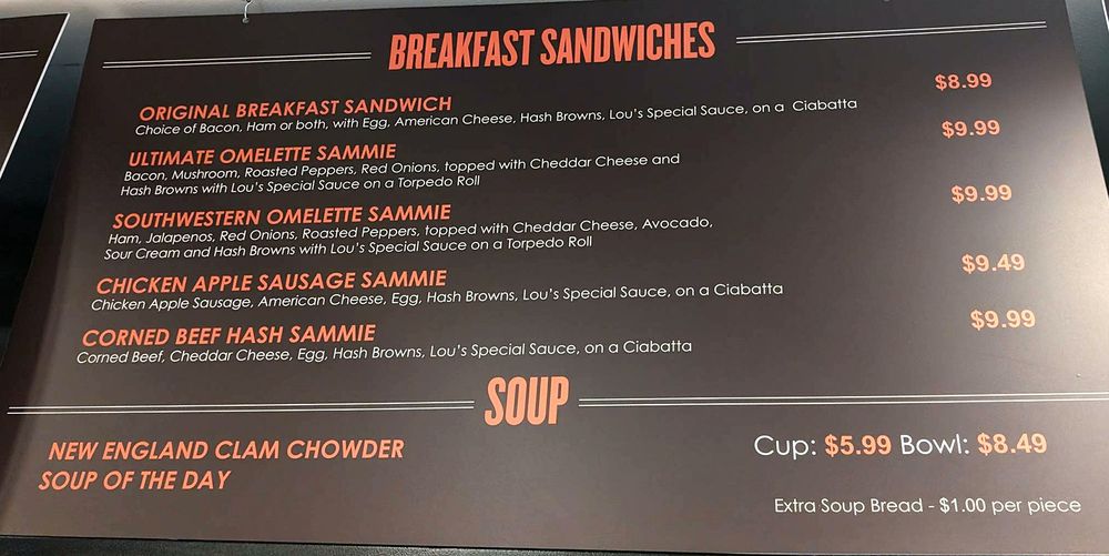 Corned beef, cheddar cheese, egg, hash browns and Lou's special sauce on a ciabatta.
