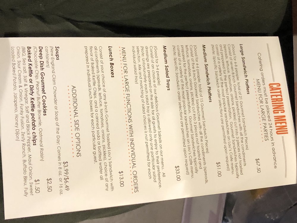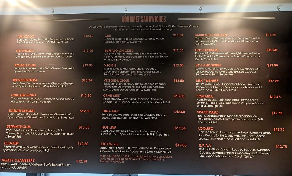 Roast beef, turkey, salami, ham, bacon, Swiss cheese, Lou's special sauce, Dijon mustard on a soft and sweet roll. Includes lettuce, tomatoes, red onions, pickles and jalapeno spread.